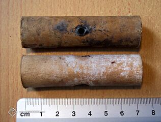 Ausgebrannte Effektkörper von Farfalle-Bomben. Die Wandung der Papphülse ist mittig durchbohrt.