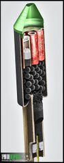 Perfekte 3D-Darstellung einer Großfeuerwerksrakete mit Sternbukett und Knallpatronen. Der Raketentreiber ist als Endbrenner ausgeführt, über dem eigentlichen Treibsatz befindet sich ein langsamerer Satz, die Zehrung, darüber gekörntes Schwarzpulver als Zerlegerladung. Die Knallpatronen besitzen eine Anfeuerung und Verzögerung aus gepresstem Schwarzpulver, darüber befindet sich loser Blitzknallsatz.