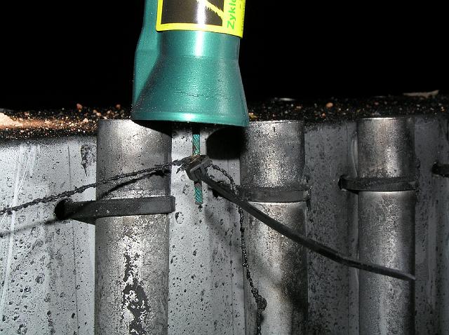 Stehengebliebende Rakete in einem Abschussgestell. Die Litze (abgebrannt, man sieht nur noch die Drahtseele) war falsch verleitet besaß einen zu kleinen Berührungspunkt mit der Anzündschnur der Rakete.