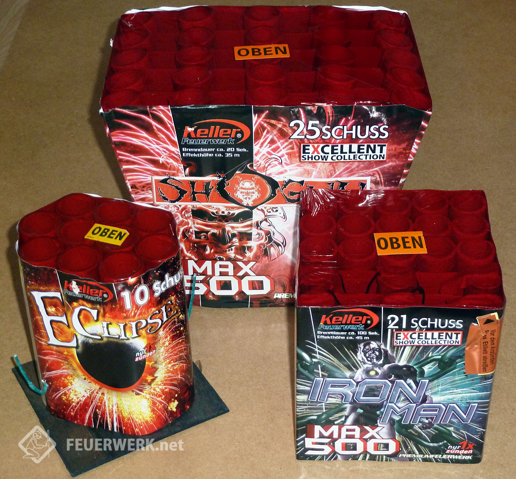Großkalibrige Feuerwerksbatterien (Jahre 2010 + 2011, Klasse II/Kategorie F2) der Firma Keller Feuerwerk.
