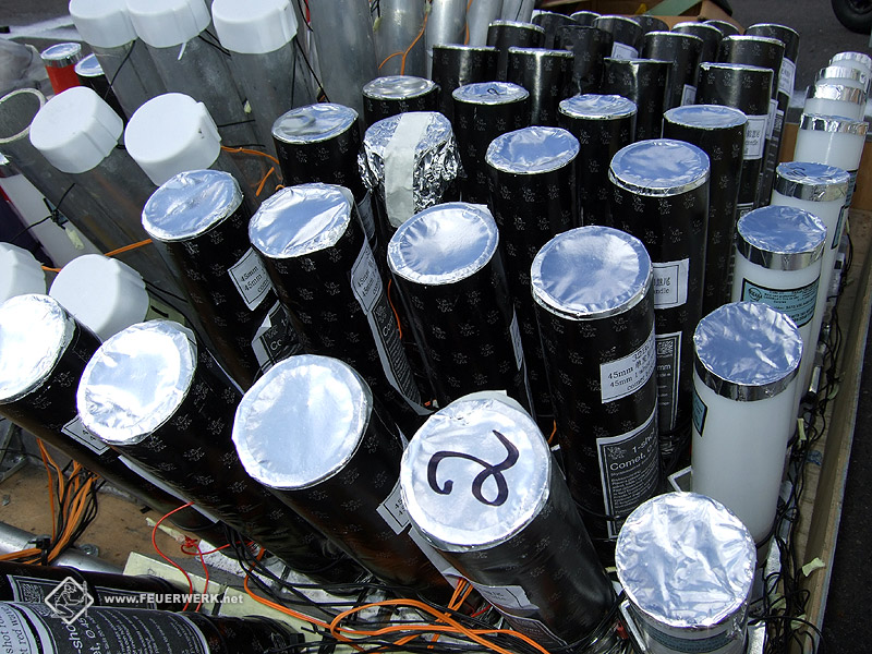 Verschiedene One Shot Comets bis Kaliber 45mm, gefächert. Hinten (links) in Bombettengestellen aus Aluminium von den Feuerwerkern selbst verladene Kometen, vorne fertige One Shots mit Papp-Abschussrohren (schwarz) und solche aus Plastik spanischer Fertigung (weiß).