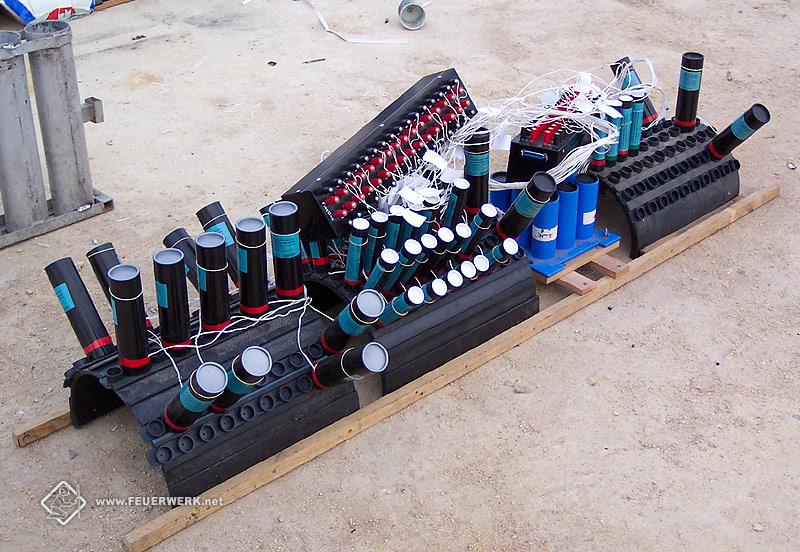 Verschiedene One Shots spanischer Fertigung (Antonio Caballer) in Valencia. Die Effekthülsen und das Bodenplatten-Stecksystem sind aus HDPE. Die Effekte sind an FireOne-Verteilern verleitet.