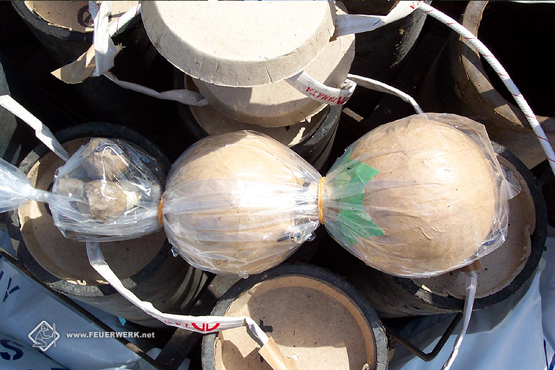 3-fach-Peanut Shell (2 Kugelbomben und zusätzliche Parasiten als Aufstiegseffekte) der Firma Tamaya, Japan (gesehen in Tarragona, Spanien).