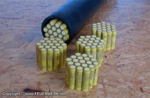 19er Bündel mit Pfeifpatronen, abgeschossen mittels Schwarzpulver-Treibladung aus 75er Mörserrohren.