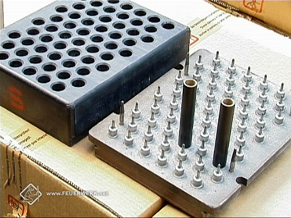 Die beiden Hälften werden aufeinandergesetzt und mit leeren Papphülsen bestückt. In der hydraulischen Presse werden dann in mehreren Pressvorgängen erst die Hülsen vollständig in die Form gedrückt, dann der Ton für die Düsen gepresst, dann feinkörniges kommerzielles Schwarzpulver trocken oberhalb des Tones verpresst und letztlich die fertigen Treiber aus den Hülsen gedrückt. Die Stempel auf der unteren Hälfte der Form sorgen dafür, dass der Tonpfropfen nicht mit dem Hülsenrand abschließt, sondern erst etwa 1cm tiefer beginnt. Der Dorn auf den Stempeln erzeugt beim Pressen im Ton die Düse sowie ragt noch wenige Millimeter als Seele in das Schwarzpulver. Es handelt sich aufgrund der sehr kurzen Seele also um Endbrenner-Raketentreiber.