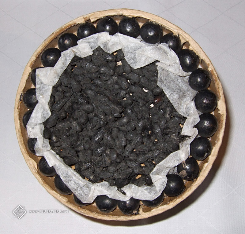 Schnitt durch eine Warimono-Kugelbombe (Chrysantheme oder Peony). An der Innenseite entlang der Wandung der Bombenschale ist eine Lage Sterne angeordnet, im Bombeninneren nur durch Seidenpapier abgetrennt befindet sich die Zerlegerladung, hier: Schwarzpulver "dragiert" auf Reisspelzen.