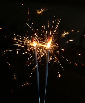 Diese Reaktion erzeugt genügend Hitze, um die im Gemisch enthaltende Eisenspäne zum Glühen zu bringen. Der gebildete Stickstoff übt einen leichten Gasdruck in der glühenden Wunderkerzenmasse aus, so dass u.a. glühende Eisenspäne nach außen weggeschleudert werden. Das glühende Eisen reagiert mit dem Luftsauerstoff, wobei die Temperatur der Eisenfunken während der Oxidation zu Eisenoxid (Fe2O3) erhöht wird: