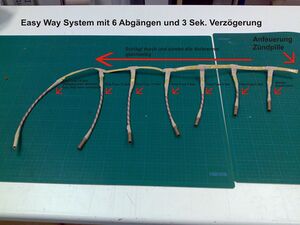 Besonderheit beim Easyway-System ist, dass die Stoppine beim Entzünden durchschlägt und jeden (unterschiedlich langen) Time-Fuse Vorbrenner zeitgleich entzündet. Somit brennen alle Vorbrenner auf Schlag, jeder 3 Sekunden länger als der Vorherige.