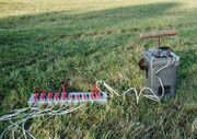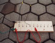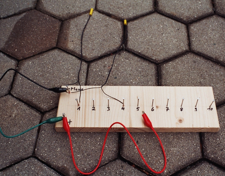 14:49, 9. Feb. 2007 NagelbrettVerkabelt.jpg (Datei) 418 KB Nach Anschluss aller Zündkreise wird eine geeignete Spannungsquelle (Akku, Zündmaschine) an die Nägel "Masse" und "+" angeschlossen (grünes und schwarzes Kabel). Ein weiteres Kabel (rot) wird an den "+"-Nagel angeklemmt und dient als Schalter: berühr 1
