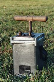 09:43, 18. Okt. 2007 Generatorzuendmaschine usarmy.jpg (Datei) 74 KB Alte amerikanische Generator-Zündmaschine mit Zahnstange. Typenschild: US ARMY Blasting Maschine Serial No. Capacity ''weiteres folgt'' {{©FEUERWERK.net}} Kategorie:Bilder:Technik 1